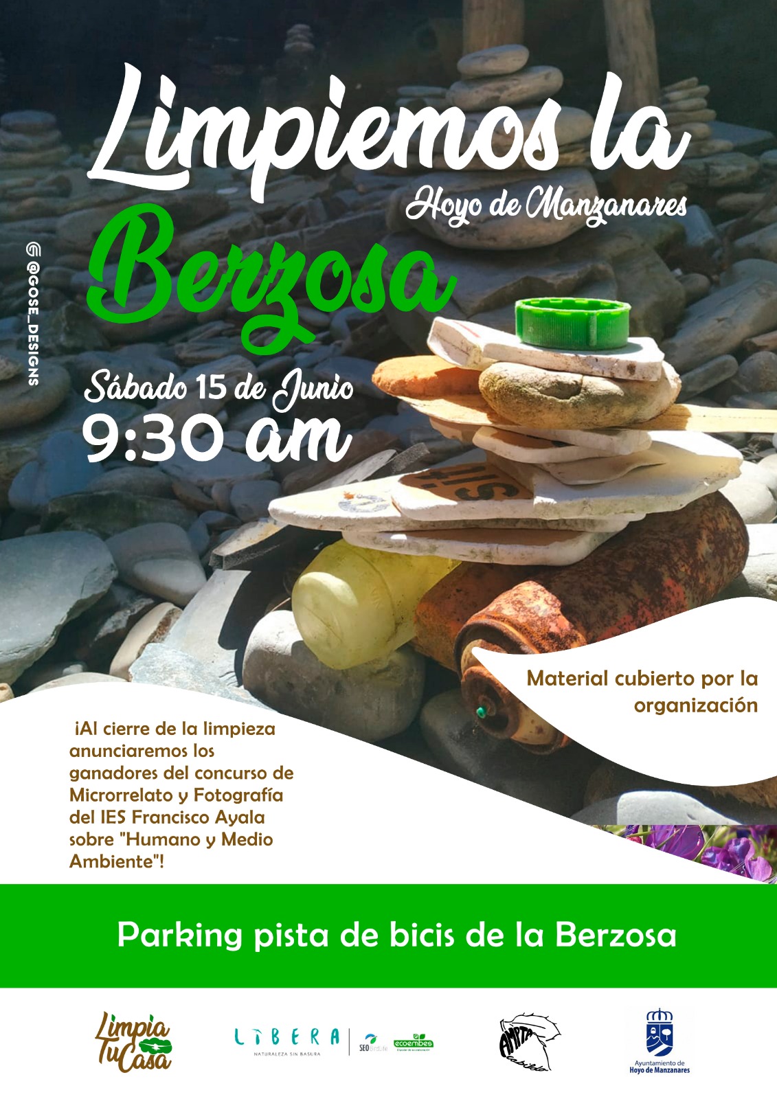 Adjunto os remitimos información sobre la iniciativa remitida por el colectivo #Limpiatucasa!, patrocinada por el Ayuntamiento de Hoyo de Manzanares y otras asociaciones como LIBERA-Naturaleza sin Basura, ECOEMBES, SEO Birdlife, AMPTA Cabilda y con la participación del Colegio Virgen de la Encina y del IES Francisco Ayala, consistente en una limpieza del campo en la finca de Las Lanchas en la Berzosa, el próximo día sábado 15 de junio.